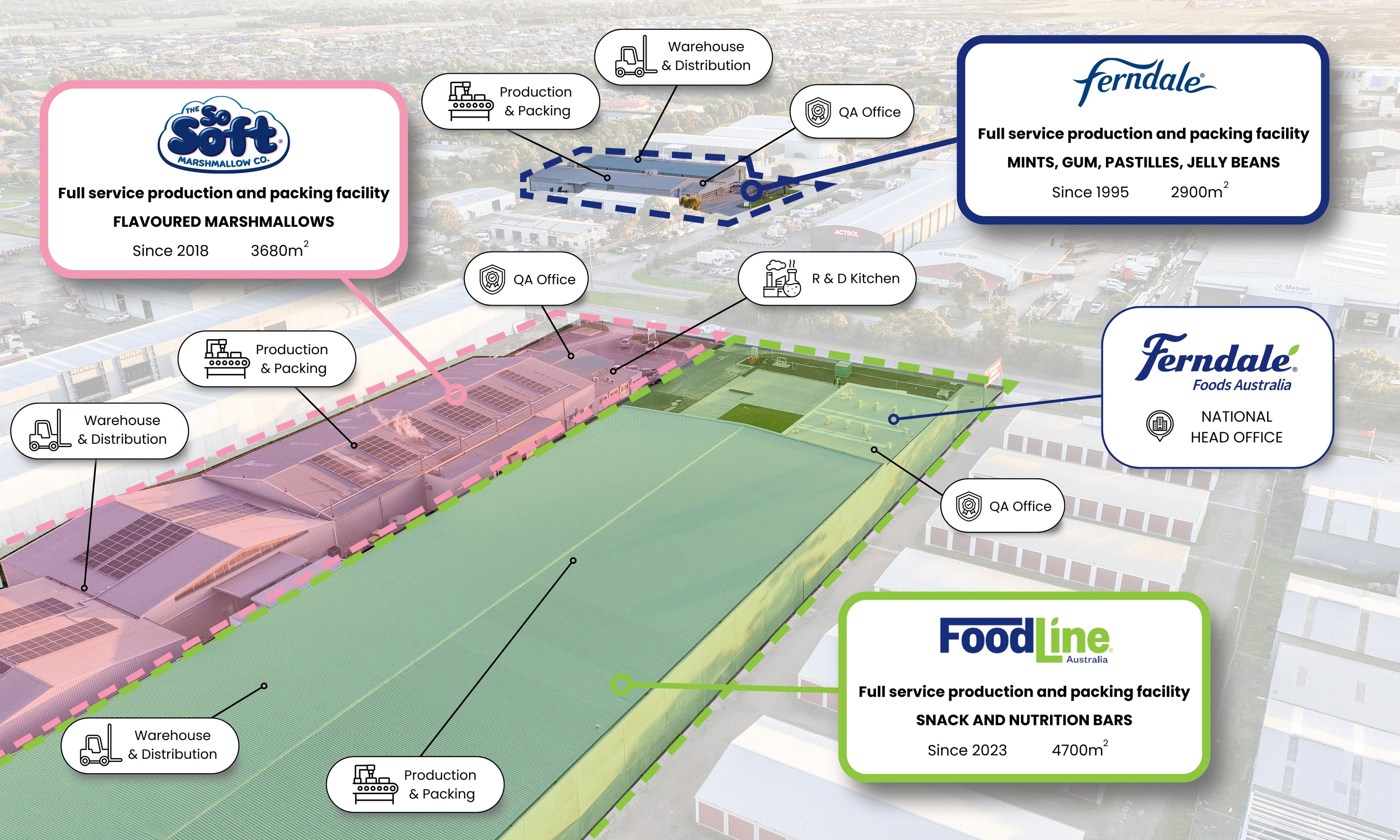 With over $35 million invested in world-class facilities and cutting-edge technology over the past decade, Ferndale is built for high-volume, high-quality production. Our three Ballarat-based facilities are designed for scale, efficiency and precision, supporting some of Australia’s most recognised brands in confectionery, bars and snacks.